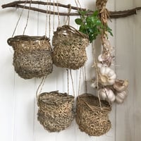 The most delicious raw hemp twine has been crochet into this ridiculously useful pouch. Great to hang in your kitchen to store your garlic, ginger, turmeric etc. or use as planter for your fave air plant. Each one is hand made with a tonne of love and finished with a foraged vine rim, salvaged from my local bush regeneration group. Each one is unique, and as the vine is seasonal will differ slightly dependant on Mother Nature. Rim: approx 10cm diameter, basket: about the size of a softball.