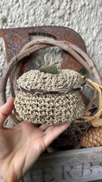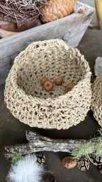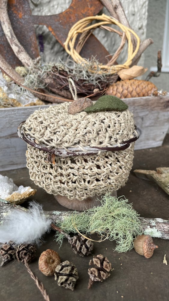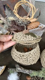 Gather and store your treasures in these cute little pods complete with lid. All hand crochet with European hemp twine, finished with acorn lid and hand felted leaf. About the size of a softball, perfect for jewellery, bits & pieces or foraged treasures.